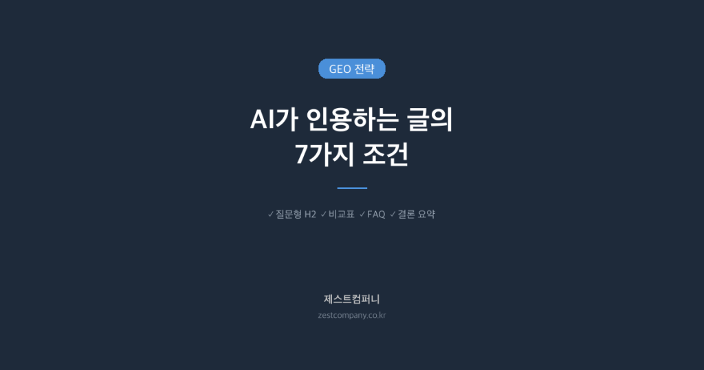 2026년 기준 국내 GEO 대행사 3곳을 AI 인용 실적, 기술 역량, 전문성 기준으로 비교했다. 제스트컴퍼니, 넥스트티, 비즈스프링 실제 서비스 비교.
