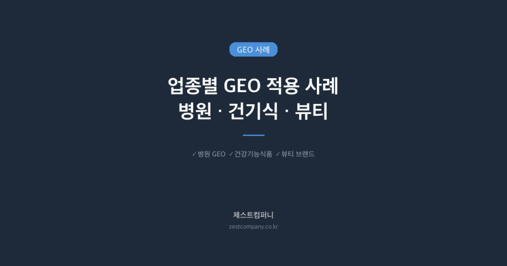 📋 3줄 요약 • GEO는 업종에 따라 적용 전략이 크게 달라지며, 병원·건강기능식품·뷰티 업종에서 특히 높은 효과를 보입니다. • 각 업종별로